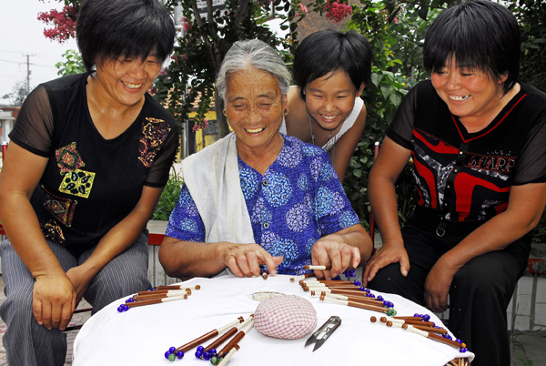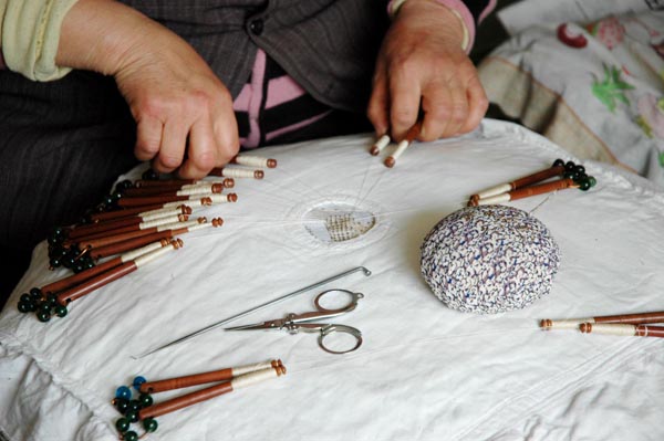 织花边 临淄花边工序复杂,编织方式变化多端,每个细节都无可挑剔,有着机器制作无法替代的灵气和美感。小型作品精美绝伦、玲珑剔透,大型作品高贵典雅、气派豪华,是世界许多国家国宾馆、宴会厅的装饰用品,代表了中国编织技术的高超水平。临淄花边编织、缝合、刺绣等为纯手工制作,其编织仍然保留了原始的特色,是目前为数不多的原始手工技艺之一,其中的很多图案表现了欧洲地区古老的地域文化特别是宗教文化,是对西方文明的一种保留、 临淄花边起源于汉代初期,有2000多年的历史。19世纪末,临淄花边与欧洲技术相结合,产生了现代意义上的花边。临淄花边从产生到现在,先后经历了梭子长条花边、棒槌花边大套与现代花边三个阶段。 梭子长条小花边,俗称“兰杆”,是用一条木凳固定经线,然后用缠有丝线的木梭,依据图案,在经线上来回穿织而成,称长条花边。当时是以母教女、嫂传妹的途径传播的,主要分布在临淄区齐都、皇城等地。1887年,德国传教士发现临淄的梭子长条花边与意大利的棒槌花边相似,便将棒槌长条花边带进来,并在教徒中传授编织技术,棒槌长条花边便在临淄生根而发展起来。生产工具由棒槌代替了梭子,编织者不再受工作场地的限制,很快就遍及临淄全县。1895年,齐都和敬仲两地的耶稣教徒办起了经营花边的作坊,他(她)们是临淄花边业的第一代经营者。1905年,姚宾才在临淄西关创办的“益成祥”花边庄是临淄花边业的第二代。之后,白兔丘的王星元、石佛堂村的崔太来等分别开办了花边庄。新中国成立后,建立了“临淄花边生产合作社”,到1956年,年产值达到105万元,居当时全县产值之首。社会上从事花边半成品加工的有三四万人,各类图纸近千套,品种几千个,取得了“国家生产许可证”,并注册了“齐城牌”商标。1959年,临淄花边在人民大会堂山东厅使用。在各级美术品展览会上,临淄花边多次获图案设计奖和产品创作奖。1973年参加了全国工艺美术作品展览,入编“中国工艺美术集”。 临淄花边从编织到成型,分为编织、刺绣和整形处理三大部分,包括设计、放缩样、复制、刺版等几十道工序。编织是临淄花边最重要的工序。 临淄花边在20世纪50—80年代曾经非常兴盛,但是随着经济发展和赚钱的渠道增多,织工获利少,家家户户妇女织花边的景象已经不复存在,仅剩不多的老年妇女还在编织,从事花边生产的厂家在90年代也已破产,目前仅剩几家个人企业勉强支撑,亟待保护与传承。