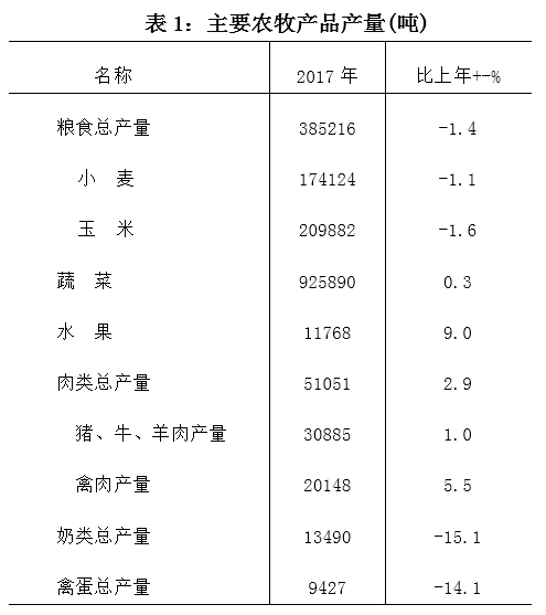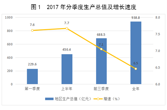 2017年,面对复杂的宏观经济形势,全区上下在区委、区政府的正确领导下,以习近平新时代中国特色社会主义思想为指导,围绕建设“家敦民富、大气精美”的现代化临淄这一奋斗目标,积极推进供给侧结构性改革,全年经济稳中有进,社会事业全面进步,新旧动能转换取得新进展,转型升级越上新台阶。 一、综 合 初步核算,全区实现生产总值(GDP)938.8亿元,按可比价格计算,比上年增长6.5%。其中,第一产业增加值38.4亿元,增长4.7%;第二产业增加值579.8亿元,增长5.8%;第三产业增加值320.6亿元,增长8.1%。产业结构更趋优化,三次产业比由上年的4.45:62.56:32.99调整为4.09:61.76:34.15。第三产业占GDP的比重较上年提高1.16个百分点,对经济增长的贡献率为39.4%,较上年提高7.1个百分点。 全年城镇新增就业13690人,比上年增加1800人。失业人员再就业达到9314人,比上年增加2032人,其中困难群体再就业850人。年末城镇登记失业率2.34%,低于全区3%的控制目标。新增省级“四型就业社区”3个,市级“四型就业社区”8个,人社公共基础信息数据库,自然人信息库完成信息采集录入49.3万人,法人单位信息库采集录入信息2394家。 全区500万元以上外来投资项目85个,比上年增加24个;实际到位资金136.3亿元,比上年增长36.0%。重点领域招商力度加大。战略性新兴产业外来投资项目40 个,比上年增加6 个,实际到位资金15.7 亿元,比上年增长14.6%;服务业招商引资项目20个,比上年增加13 个,实际到位资金27.3亿元,比上年增长133 .0%;股权招商及上市融资项目 8个,实际到位资金51.9亿元。大项目实现较快增长。过亿元的招商引资项目 67个,比上年增加18 个,实际到位外来投资121.9亿元,比上年增长30.2%。斐讯ID大数据中心、颐高电子产业园 、鲁中现代综合物流产业园等一批重大产业招商项目落地。 二、动能转换与创新 高新产业产值占规模以上工业总产值比重达35.8%,较年初提高1.2个百分点。装备制造业产值比上年增长0.7%,占规上工业总产值的比重为5.8%,比上年提高0.2个百分点。以信息传输、软件业和信息技术服务业,科学研究和技术服务业等行业为代表的战略性新兴服务业营业收入达16.0亿元,比上年增长23.5%。 技术人员数量继续增长,初级、中级、副高级和正高级专技人员分别新增439人、209人、86人和2人;初级、高级和技师技能人员分别新增2100人、88人和2人;新增齐鲁首席技师1人,市首席技师2人,市有突出贡献技师1人。 年末拥有省级工程技术研究中心13家,市级工程技术研究中心41家,市级产业技术创新战略示范联盟10家,院士工作站10家。完成发明专利申请806件,授权143件,有效发明748件,万人拥有量超过11.5件,PCT国际申请41件。 三、农林牧渔业 全年实现农林牧渔业总产值64.4亿元,按不变价格计算,比上年增长4.9%。其中,农业产值50.6亿元,增长4.9%;林业产值0.4亿元,增长3.6%;牧业产值12.1亿元,增长2.8%;渔业产值105万元,增长3.1%。农林牧渔服务业产值1.5亿元,增长10.8%。全年粮食总产量38.5万吨。其中,夏粮产量17.4万吨,比上年下降1.1%;秋粮产量21.1万吨,比上年下降1.7%。蔬菜、水果产量分别为92.6万吨和1.2万吨;肉类、奶类、禽蛋产量分别达5.1万吨、1.3万吨和0.9万吨。 以思远为代表的农业服务业企业推出3.0版农保姆管理系统,汇聚20余种果蔬的标准化服务大数据,包括1000余部相关教学片,296门标准化种植学习课程等。实现山东、山西、陕西、内蒙等12个省市区的91个加盟分社和2532个村级服务站的互联互通,为全国61300余名标准化社员提供移动化、精准化的标准化种植全流程服务。农保姆管理系统有效降低了农药、化肥投入量,提高了农作物产量,成为农业部农业农村大数据实践案例。 四、工业和建筑业 全年规模以上工业增加值比上年增长5.4%;工业总产值比上年增长7.8%;主营业务收入比上年增长3.7%;利润比上年下降10.0%;利税比上年下降3.2%。 年末有资质的建筑企业98家,全年实现建筑业总产值 107.3亿元,比上年增长8.0%。其中,建筑工程产值76.1亿元,比上年增长4.7%;安装工程产值28.4亿元,比上年增长21.9%。本年新签合同额为115.7亿元,比上年增长21.9%。房屋建筑施工面积84.3万平方米,比上年增长67.3%。 五、固定资产投资 全年完成固定资产投资470.5亿元,比上年增长1.7%。从产业划分看,第一产业投资4.4亿元,比上年下降33.1%;第二产业投资236.5亿元,比上年下降32.2%;第三产业投资229.6亿元,比上年增长113.9%。 全年完成房地产开发投资27.3亿元,比上年增长38.5%。商品房销售面积94.1万平方米,比上年增长47.1%。商品房销售额58.3亿元,比上年增长51.8%。 六、内外贸易 全年实现社会消费品零售总额294.8亿元,比上年增长10.0%。限额以上贸易业平稳增长,其中批发业实现销售额209.2亿元,比上年增长25.5%;零售业实现销售额44.5亿元,比上年增长11.2%;住宿业实现营业额1.1亿元,比上年增长14.8%;餐饮业实现营业额8.3亿元,比上年增长11.1%。 全年实现进出口总额141.9亿元,比上年增长74.6%。其中,进口额102.7亿元,比上年增长132.7%;出口额39.2亿元,比上年增长5.6%。全区实际利用外资5.7亿元,比上年增长27.4%。 七、交通、邮电和旅游 全年公路客运量(公交客车运输) 3002万人,比上年增长1.0%;公路客运周转量(公交客车运输)61100万人公里,比上年增长1.0%;公路货运量10295万吨, 比上年增长2.0%,公路货运周转量126.1亿吨公里, 比上年增长6.0%。年末公路通车里程达到621.2公里。 全年邮电