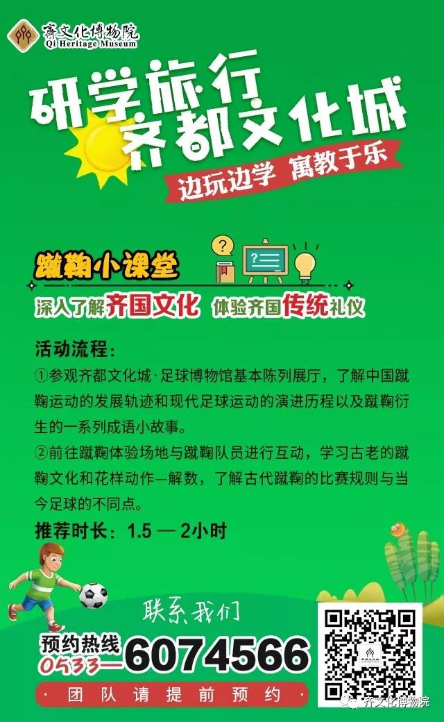 “足下春秋行”是齐文化和蹴鞠文化研学游的主打品牌。“足下”是第二人称敬词,也代表着足球和蹴鞠是从足下开始的运动。“春秋”则有两层含义,一是指春秋战国的历史时期,二是指社会风貌。“足下春秋行”作为文旅融合的载体,研学项目深受孩子们的认可和喜爱。 齐文化博物院结合自身资源特点,设立了各项研学实践课程和线路,主题特色鲜明,引导学生传承中华优秀传统文化,坚定文化自觉和文化自信。 品牌是文化产业的载体,文化产业的开发离不开品牌的打造。齐文化博物院立足世界足球起源地的文化优势,与英方共同打造世界足球文化高峰论坛,举办中超、中乙取球仪式,赋予世界足球起源地新的内涵。 “足下春秋行”是文旅融合的载体。作为研学品牌,“足下春秋行”研学项目内容丰富,形式多样,得到社会各界的一致好评。 齐文化小课堂根据学生年龄、专业特点和不同学科的教学内容需要设置齐文化相关课程,重点介绍齐国历史人物故事以及珍贵馆藏文物,让同学们更进一步的走近齐国历史,构建起同学们了解齐文化的兴趣。 蹴鞠表演队负责教授学生基本的技巧、解数动作和蹴鞠相关知识,让孩子们亲身体验唐宋时期盛行的单球门对抗赛。 参观齐都文化城·齐国文字博物馆二楼齐国瓦当展厅,学习齐国瓦当相关知识。随后在齐都文化城·齐国文字博物馆三楼传拓体验区,根据传拓员工指导,体验瓦当拓印。 多项研学游项目紧张筹划中,未来研学项目将更加丰富! |