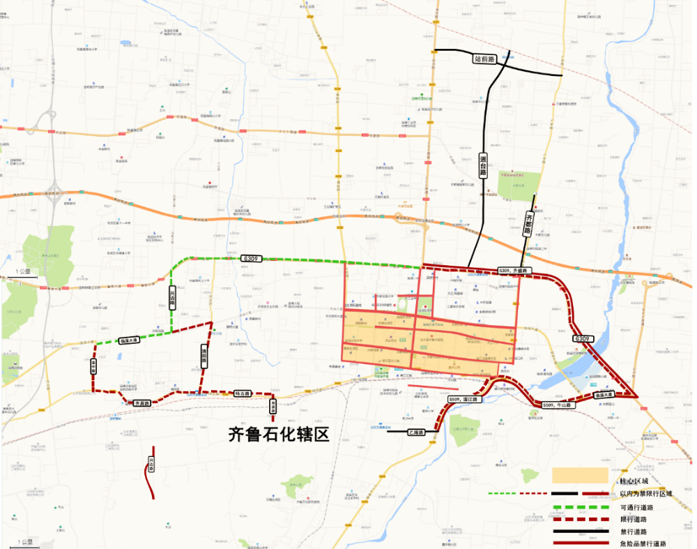 为预防和减少道路交通事故,有效防治机动车排气污染,为市民创造良好的道路交通环境和空气质量环境,根据《中华人民共和国道路交通安全法》《中华人民共和国大气污染防治法》《危险化学品安全管理条例》(国务院第591号令)《山东省机动车排气污染防治条例》等法律法规,结合我区实际,对货运车辆禁限行区域路段进行调整。现通告如下: 一、禁限行管控区域及道路 (一)限行区域:金中路(临淄大道至齐周路,含)、临淄大道(金中路至兴边路,不含) 、临淄大道(兴边路至清田路,含)、清田路(含)、齐周路(金中路至清田路,含)以内合围区域。 (二)限行道路:纬五路(清田路至溡源路)、溡源路南段(纬五路以南至齐鲁石化辖区交界处)、G309齐盛路(雪宫路至皇齐路)、临淄大道(皇齐路至美陵公司路口)、牛山路东延(美陵公司路口至稷山路)、淄江路(稷山路至乙烯路)。 (三)禁行区域:G309齐盛路(兴边路至皇齐路,不含)、临淄大道(皇齐路至美陵公司路口,不含)、牛山路东延(美陵公司路口至稷山路,不含)、淄江路(稷山路至乙烯路,不含)、乙烯路(淄江路至齐鲁石化辖区交界处,含)、溡源路南段(纬五路以南至齐鲁石化辖区交界处,不含)、纬五路(溡源路至清田路段,不含)、清田路(不含)、临淄大道西段(清田路至兴边路,不含)、兴边路(不含)以内合围区域。 核心区域:辛化路(齐盛路至牛山路,含)、临淄大道(辛化路至齐都路,含)、齐都路(齐盛路至桓公路段,含)、稷山路(桓公路至牛山路,含)、牛山路(辛化路至稷山路段,含)以内合围区域。 核心道路:杨坡路(齐兴路至临淄大道)、雪宫路(齐盛路至牛山路)、闻韶路(齐盛路至临淄大道)、齐兴路(大顺路至闻韶路)、晏婴路(桑坡路至齐都路)、桓公路(辛化路至齐都路段)、南二路(雪宫路至山王东路) (四)禁行道路:站前路、遄台路(齐盛路至高铁北站)、齐都路(齐盛路至张皇路段)。 注:G309齐盛路(雪宫路至皇齐路)、临淄大道(皇齐路至美陵公司路口)、牛山路东延(美陵公司路口至稷山路)、淄江路(稷山路至乙烯路)危险化学品运输车辆禁行,其他车辆限行。兴边路(南沣路至S102)危险化学品运输车辆禁行。 原铁山路已更名为金中路,原凤凰山路已更名为兴边路,原北齐路已更名为皇齐路。 二、禁限行车辆 (一)禁行车辆:重型货车、中型货车、拖拉机、三轮汽车、低速货车、专项作业车(含营运、非营运)。 (二)限行车辆:重型货车、中型货车、拖拉机、三轮汽车、低速货车、专项作业车(含营运、非营运)、4.5T以上新能源货车。 三、禁限行管理规定 (一)限行区域及路段限行时间为每日7时至8时30分、17时至19时。禁行区域及路段禁行时间为每日0时至24时。 (二)城市物流配送货车、轻型货车、4.5T以上新能源货车除每日7时至8时30分、17时至19时以外,允许驶入禁行区域。 四、禁止通行的车辆因生产生活、市政工程建设等确需在禁行区域路段、时段通行或停靠的,应提供相应的证明材料并取得公安机关交通管理部门核发的车辆通行证(码),按指定路线、时间通行。 五、符合环卫作业要求的新能源货车及密闭运输要求的新能源渣土车和新能源混凝土运输车在公安机关交通管理部门备案车辆信息、通行路线和时间后,允许驶入通行道路。 六、本通告所称城市物流配送货车是指在本区禁限行区域及道路从事货物运输服务(运输生活必需品、鲜活农产品、冷藏保鲜产品、涉及保障民生等)的中型厢式货车和中型封闭式货车,不包括危险货物运输车、工程运输车。 七、对达不到国Ⅳ排放标准的重型和中型货车、低速货车、三轮汽车不予办理车辆通行证(码)。 八、遇有启动重污染天气橙色、红色预警时,重、中型柴油货车在城市建成区内禁止通行。 九、遇有重大活动、突发事件、道路施工等特殊情况限制通行的,另行向社会发布通告,所有车辆按通告要求执行。 十、执行紧急任务的军车、警车、消防车、救护车、工程抢险车等特种车辆不受禁限行区域路段和时段限制。 十一、对违反货运车辆禁限行管理规定的行为人,公安机关交通管理部门将根据《中华人民共和国道路交通安全法》等法律法规规定予以处罚。 十二、本通告自2023年11月1日起施行,有效期至2024年10月30日。