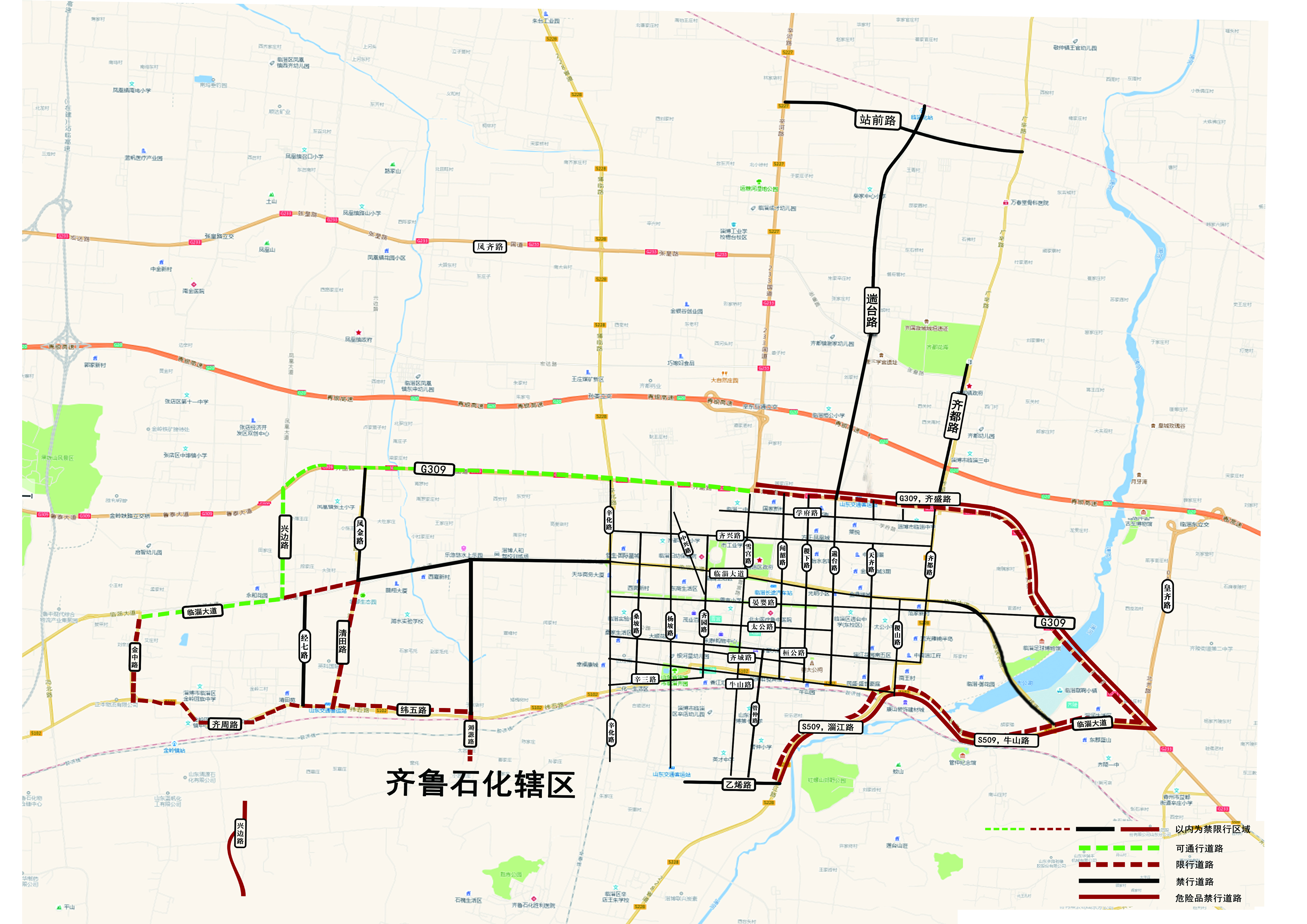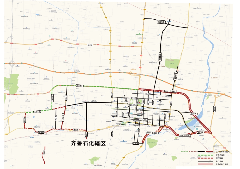 为预防和减少道路交通事故,有效防治机动车排气污染,营造良好的道路交通环境和空气质量环境,根据《中华人民共和国道路交通安全法》、《中华人民共和国大气污染防治法》《危险化学品安全管理条例》(国务院第591号令)、《山东省机动车排气污染防治条例》等法律法规,结合我区实际,对货运车辆禁限行区域路段进行调整。现通告如下: 一、禁限行区域及道路 (一)禁行区域。G309齐盛路(兴边路至皇齐路,不含)、临淄大道(皇齐路至美陵公司路口,不含)、牛山路东延(美陵公司路口至稷山路,不含)、淄江路(稷山路至乙烯路,不含)、乙烯路(淄江路至齐鲁石化辖区交界处,含)、溡源路南段(纬五路以南至齐鲁石化辖区交界处,不含)、纬五路(溡源路至清田路,不含)、清田路(不含)、临淄大道西段(清田路至兴边路,不含)、兴边路(不含)以内合围区域。 (二)禁行道路。站前路、遄台路(齐盛路至高铁北站)、齐都路(齐盛路至张皇路)、经七路禁止货运车辆通行。 G309齐盛路(雪宫路至皇齐路)、临淄大道(皇齐路至美陵公司路口)、牛山路东延(美陵公司路口至稷山路)、淄江路(稷山路至乙烯路)、兴边路(南沣路至S102)禁止危险化学品运输车辆通行。 (三)限行区域。金中路(临淄大道至齐周路,含)、临淄大道(金中路至兴边路,不含)、临淄大道(兴边路至清田路,含)、清田路(含)、齐周路(金中路至清田路,含)以内合围区域。 (四)限行道路。纬五路(清田路至溡源路)、溡源路南段(纬五路以南至齐鲁石化辖区交界处)、G309齐盛路(雪宫路至皇齐路)、临淄大道(皇齐路至美陵公司路口)、牛山路东延(美陵公司路口至稷山路)、淄江路(稷山路至乙烯路)。 二、禁限行区域及道路管理规定 (一)禁行区域及道路管理规定。 1.整车长度不超过6米、宽度不超过2.2米、高度不超过2.8米的中型厢式货车,每日早晚高峰时段7:00—8:30、17:00—19:00禁止驶入禁行区域。 2.新能源货车禁行管理如下: (1)新能源轻型货车全天不禁行。 (2)新能源牵引车全天禁止驶入禁行区域及道路,每日7时至8时30分、17时至19时禁止驶入限行区域及道路。 (3)符合环卫作业要求的新能源货车及符合密闭运输要求的新能源渣土车和新能源混凝土车,每日7时至8时30分、17时至19时禁止驶入禁行区域及道路。其他时段需向公安机关交通管理部门备案车辆信息、通行路线和时间,经确认同意后方可通行。 (4)除上述新能源车以外的其他新能源货车,每日7时至8时30分、17时至19时禁止驶入禁行区域及道路。 3.重型货车、中型货车(整车长度不超过6米、宽度不超过2.2米、高度不超过2.8米的中型厢式货车除外)、挂车、危险货物运输车、工程运输车、拖拉机、三轮柴油车、低速货车、专项作业车全天禁止驶入禁行区域。 (二)限行区域及道路管理规定。 重型货车、中型货车、挂车、危险货物运输车、工程运输车、拖拉机、三轮柴油车、低速货车、专项作业车,每日7时至8时30分、17时至19时禁止驶入限行区域及道路。 三、其他事宜 1.禁止通行的车辆因生产生活、市政工程建设等确需在禁行区域路段、时段通行或停靠的,应提供相应的证明材料并取得公安机关交通管理部门核发的车辆通行证(码),按指定路线、时间通行。 2.对达不到国Ⅳ排放标准的重型和中型货车、低速货车、三轮柴油车不予办理车辆通行证(码)。 3.遇有启动重污染天气橙色、红色预警时,重中型柴油货车在城市建成区内禁止通行。 4.遇有重大活动、突发事件、道路施工等特殊情况限制通行的,另行向社会发布通告,所有车辆按通告要求执行。 5.执行紧急任务的军车、警车、消防车、救护车、工程抢险车等特种车辆不受禁限行区域路段和时段限制。 6.对违反本通告车辆禁限行管理规定的,由公安机关交通管理部门根据《中华人民共和国道路交通安全法》等相关规定,依法予以处罚。 7.本通告自2025年10月30日起施行,有效期至2026年10月28日。 临淄区人民政府 2025年10月24日 |