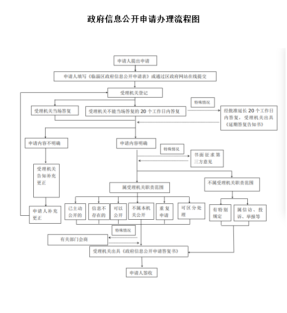 本机关办理申请人政府信息公开申请时,能够当场答复的,将当场答复;不能当场答复的,自收到申请之日起20个工作日内予以答复;确需延长答复期限的,延长答复时间不超过20个工作日,并告知申请人。政府信息涉及第三方权益的,应当征求第三方的意见,征求第三方意见所需时间不计算在期限内。