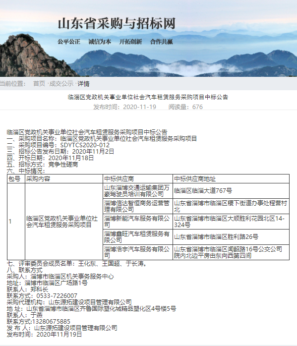 临淄区党政机关事业单位社会汽车租赁服务采购项目中标公告