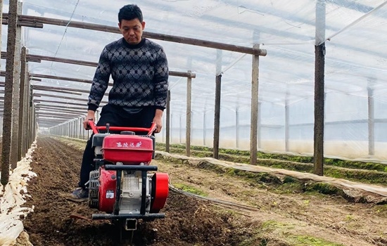 瓜农胡文凯正用旋耕机在洒满有机肥的土地上旋耕