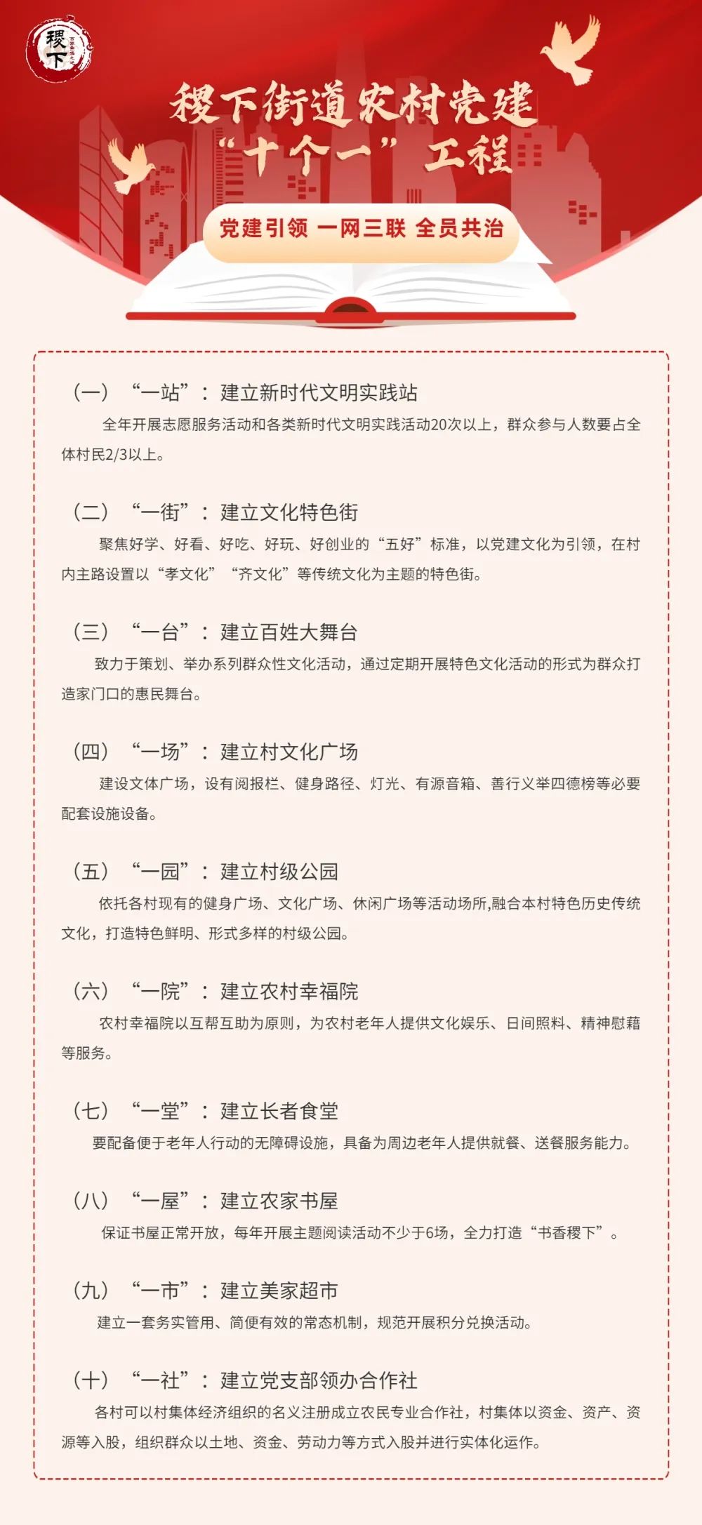为落实“创新突破、品质提升”工作要求,同时为“党建引领、一网三联、全员共治”治理模式提供有力抓手和支撑,今年年初,街道经研究决定实施农村基层党建一网三联“十个一”工程,一村一品创新丰富“一网三联”应用场景,推动乡村全面振兴。