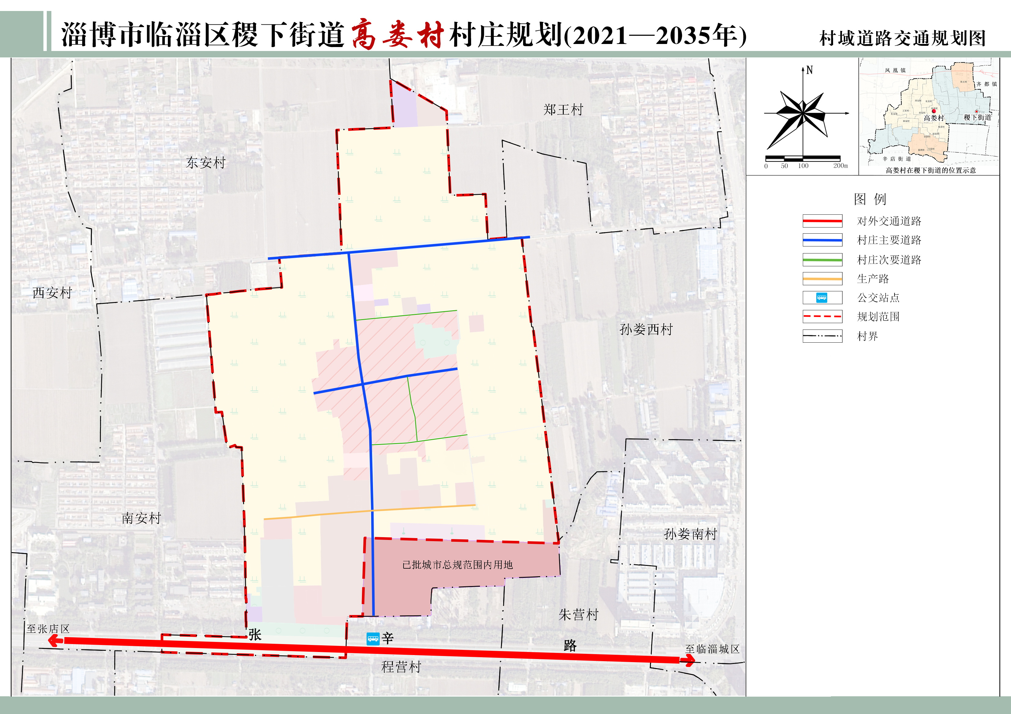 (1)对外交通:规划延续原有对外交通体系,主要通过张辛路与稷下街道及临淄城区连通。