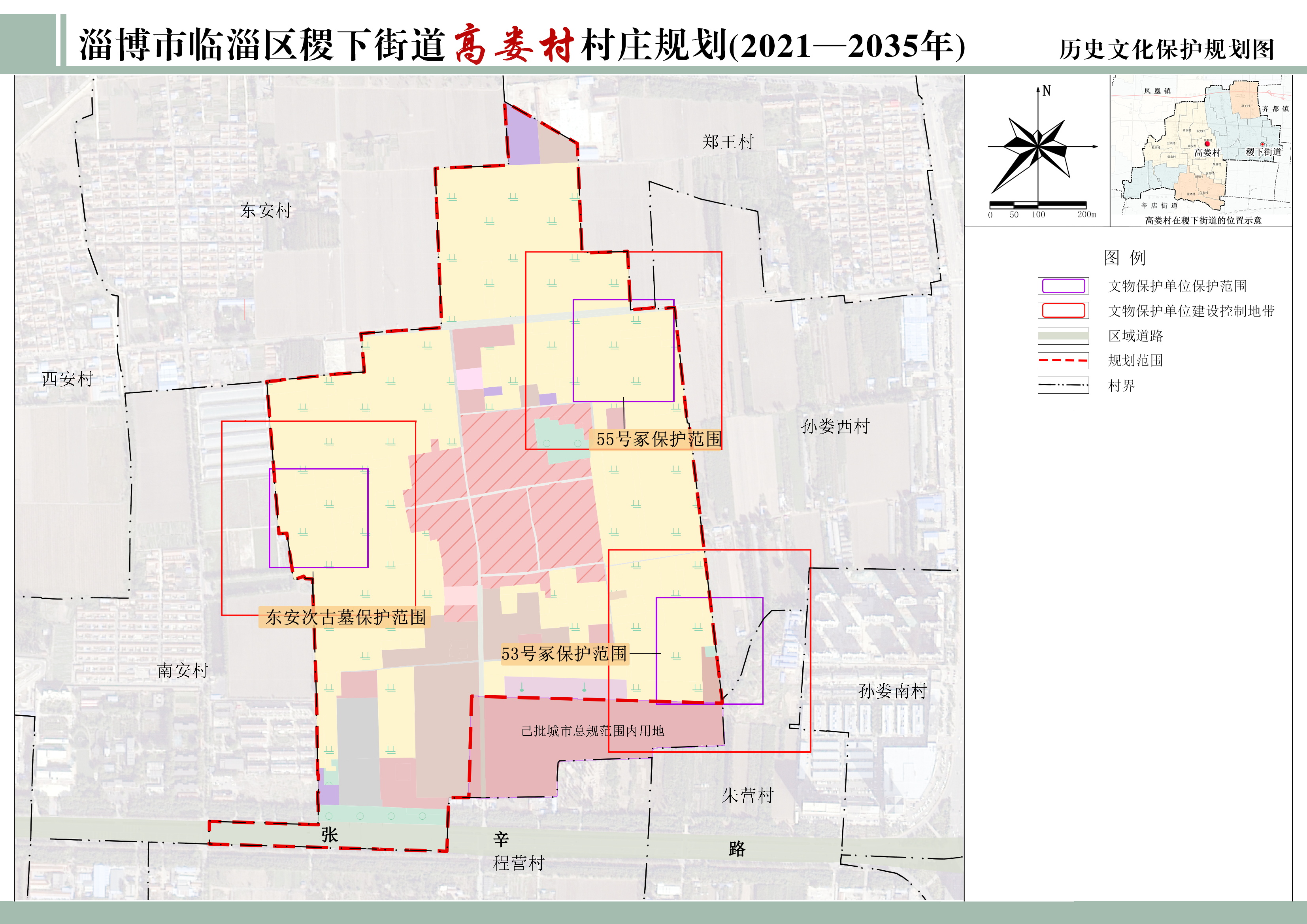 53号冢、55号冢、东安次冢为国家级文物保护单位,保护范围为墓基四周外扩100米,建设控制地带为保护范围四周外扩200米。