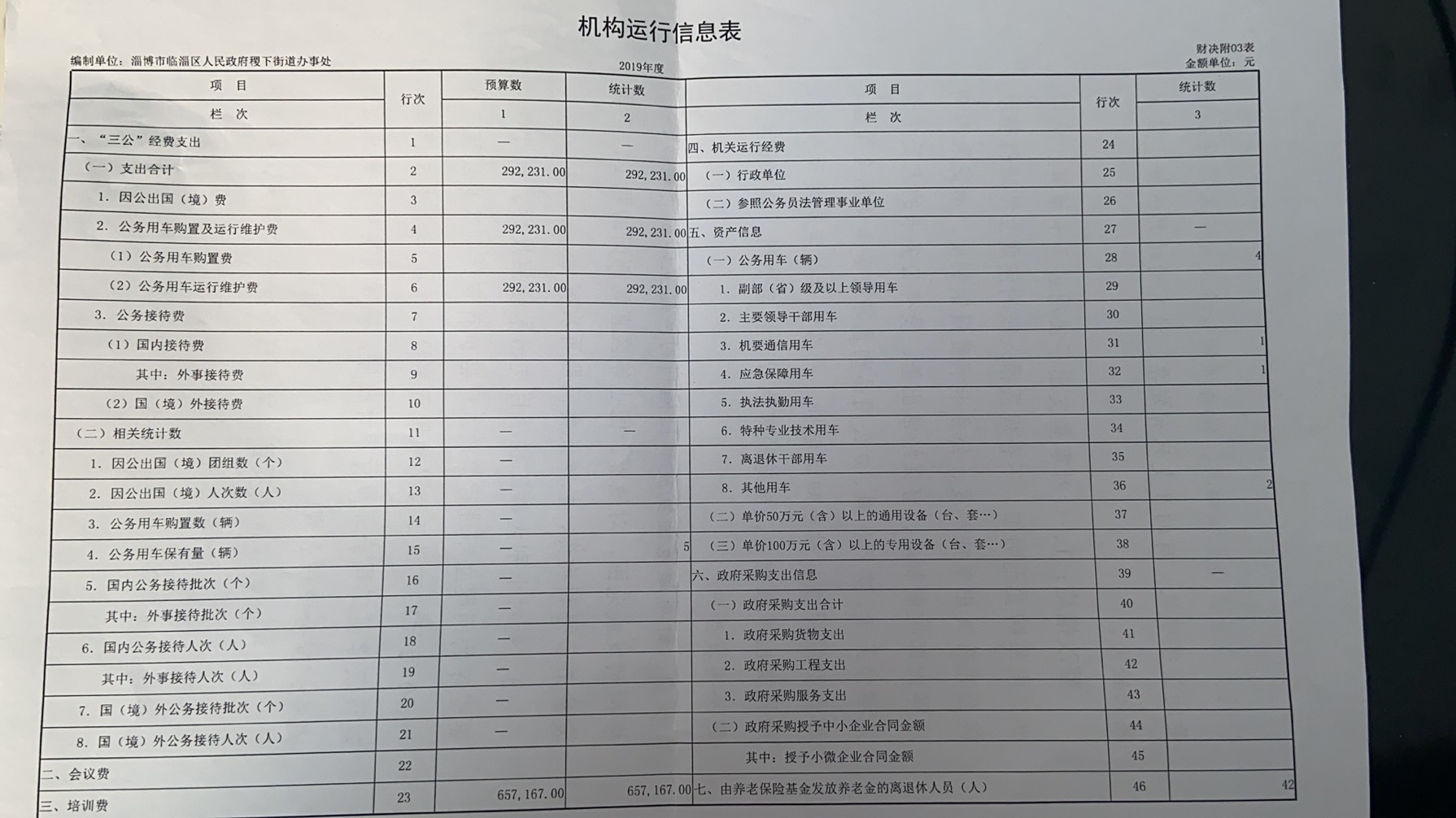 2019年,稷下街道“三公”经费决算共292231元,其中:因公出国(境)费 0 元,公务用车购置及运行维护费 292231元,共有 4 辆公务用车,其中机要通信车1辆、应急保障用车1辆、其他用车2辆。公务接待费0元。2019年“三公”经费比2018年“三公”经费增加99226元,增加原因:2019年启用大型扫保车辆,维修及燃油费用增加。