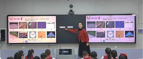 袭庆老师执教《平行与相交》。袭老师从生活场景入手,找到多组两条直线可能出现的位置关系,通过一连串的操作活动,培养了学生的空间想象能力,发展了学生的空间观念。摆一摆,脱离情境图片,具象为实物小棒;画一画,脱离实物小棒,抽象为两条直线(感悟同一平面);分一分,明确分类标准,初步感受分类;找一找,寻找生活中的平行线,沟通知识与生活的联系;画一画,尝试画平行线,进一步感悟平行。