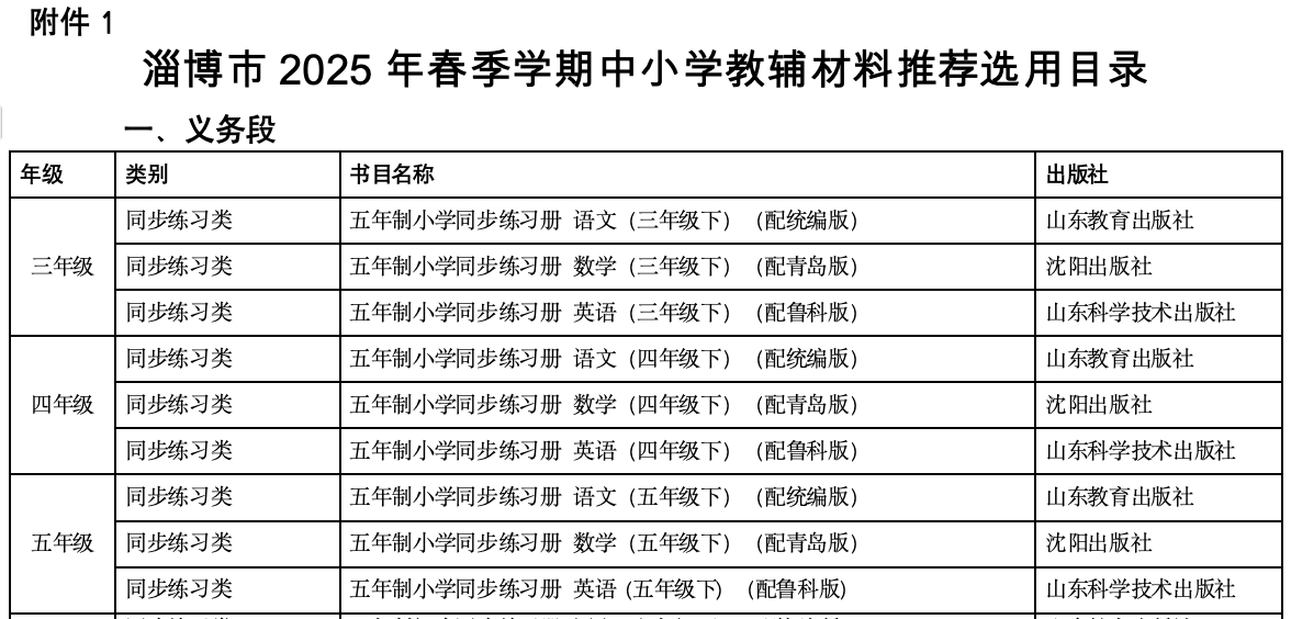 临淄区实验小学2025年春季教辅材料选用、使用目录