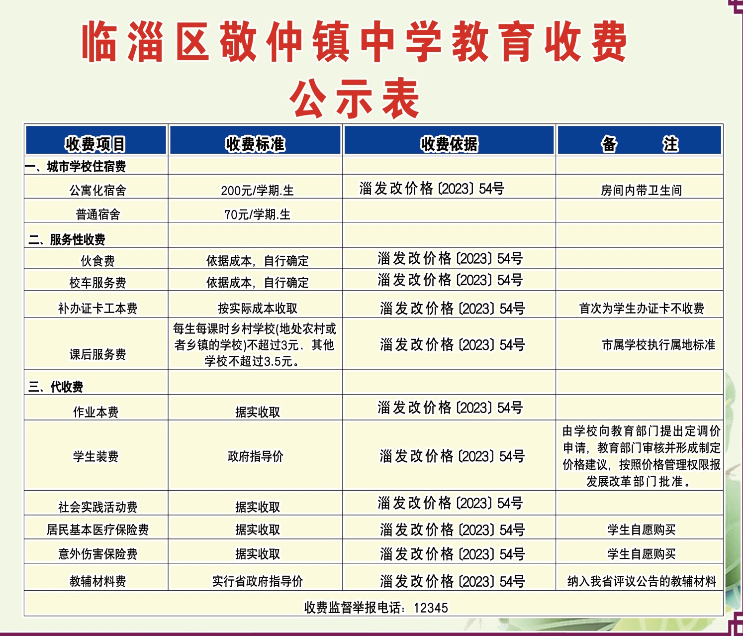 临淄区敬仲镇中学收费项目、标准及依据