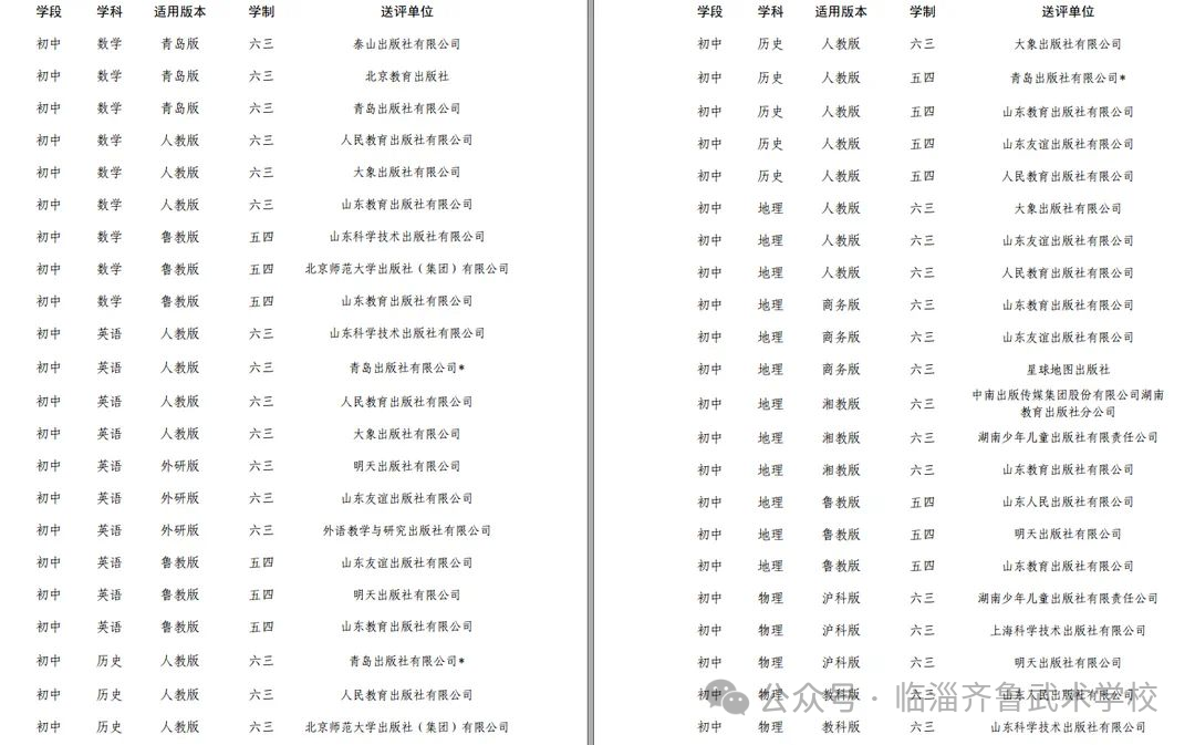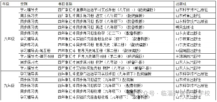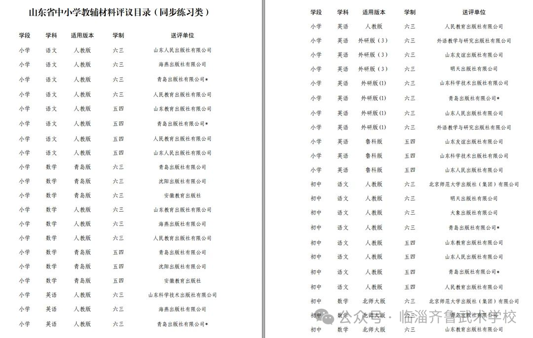 淄博市2025年春季学期中小学教辅材料推荐选用目录