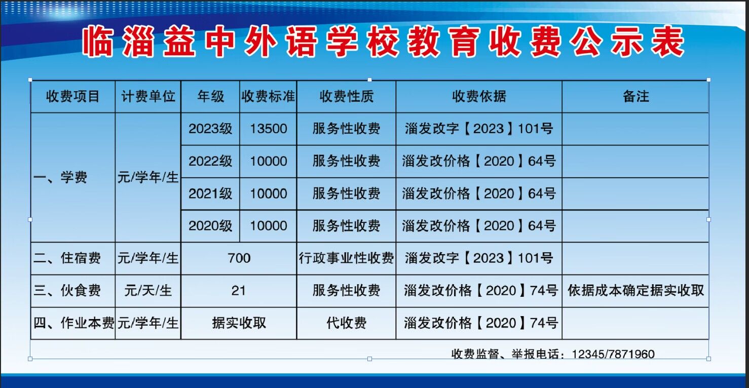 淄博市临淄益中外语学校2023年收费信息