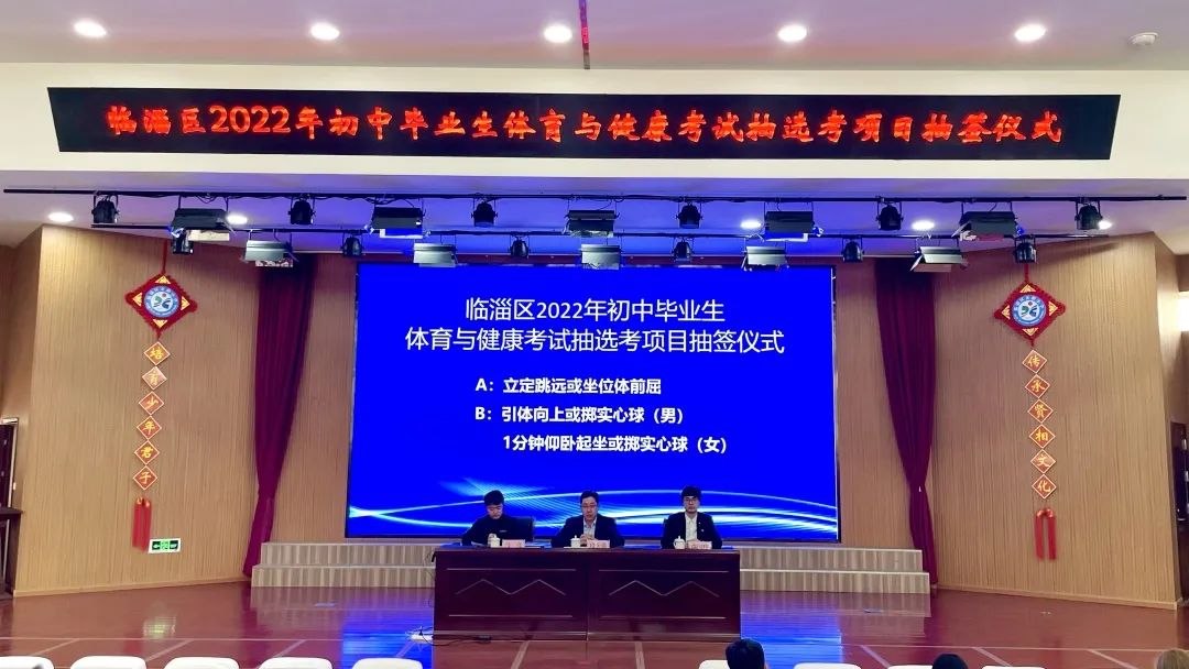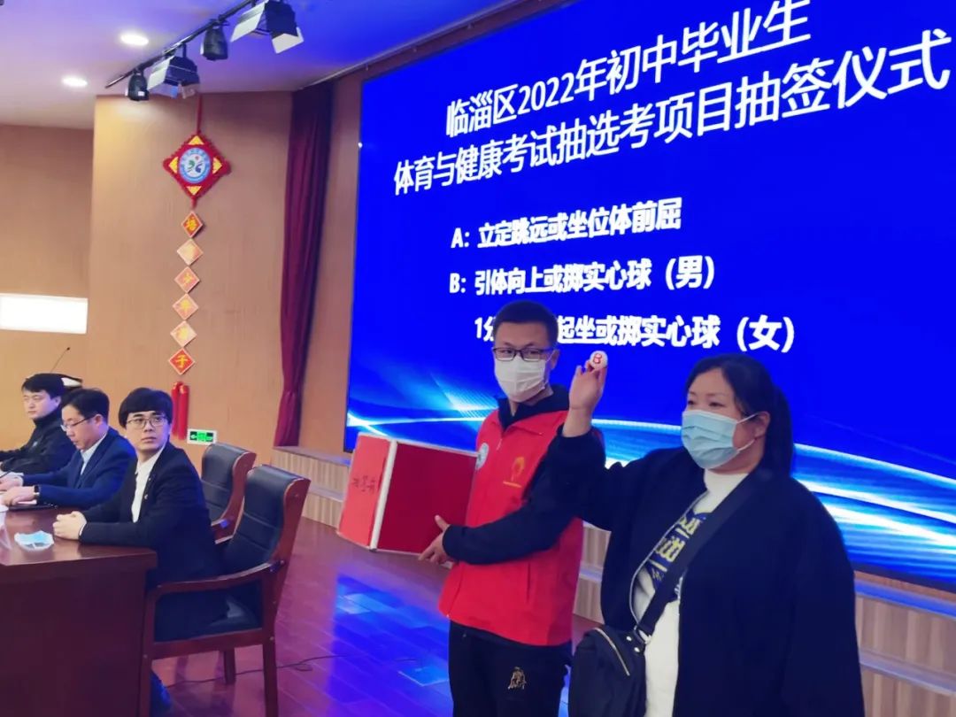 在临淄区教体局分管负责人、纪检人员、相关科室,临淄区初中学校分管校长、教师、家长代表的见证和监督下,抽签确定2022年临淄区初中毕业生体育与健康考试抽选考项目为男生引体向上或掷实心球,女生1分钟仰卧起坐或掷实心球。