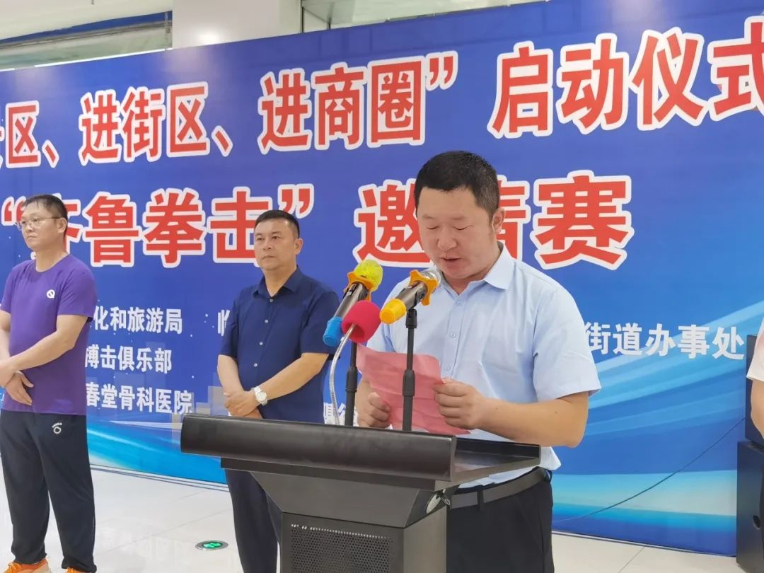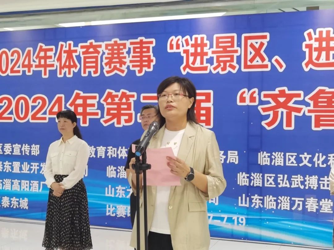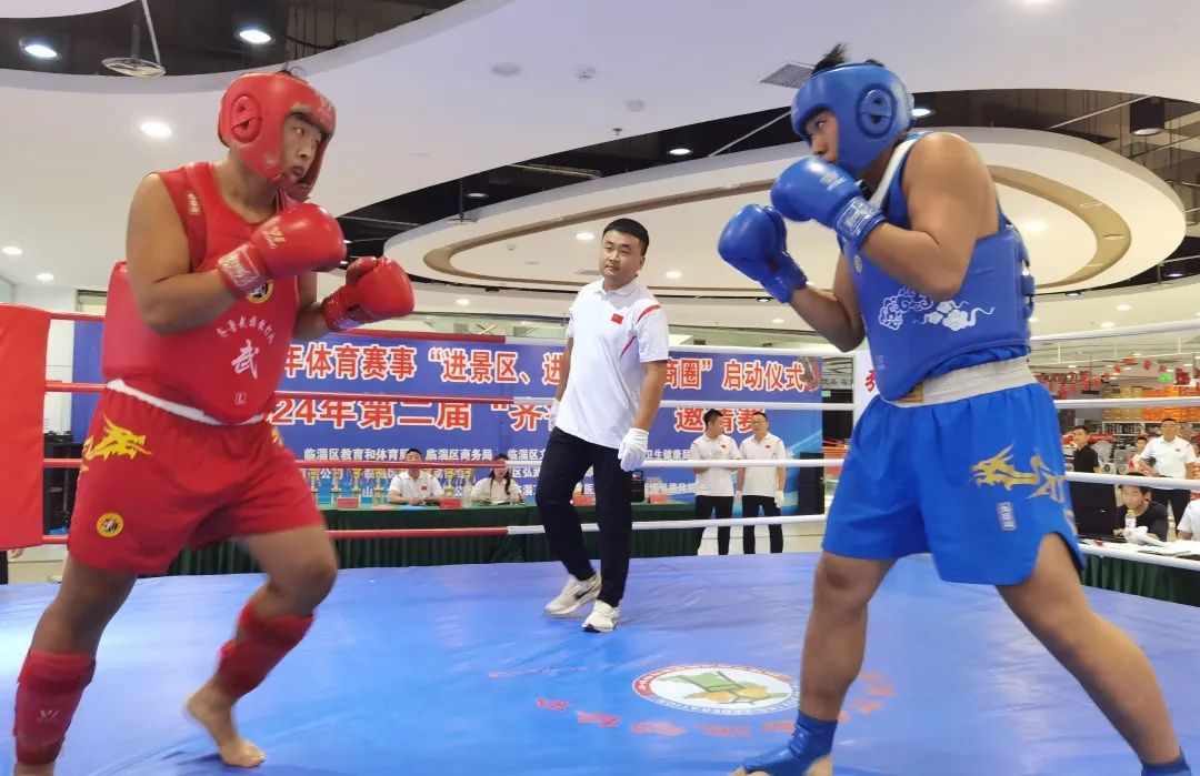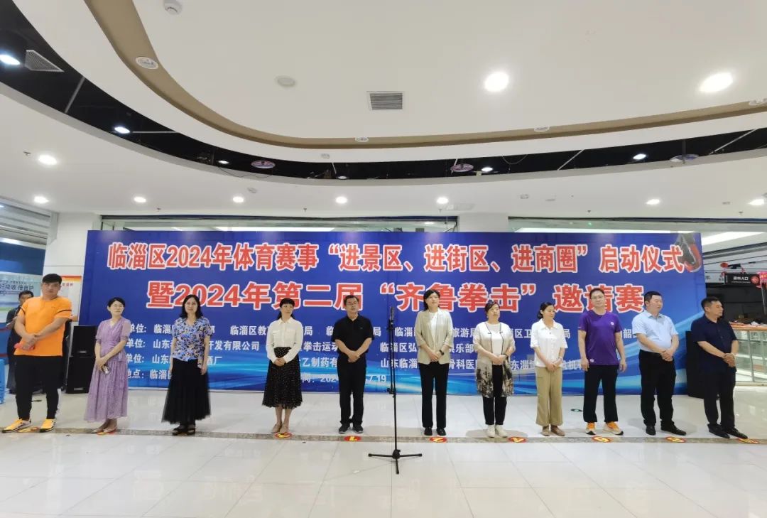 7月17日上午,临淄区2024年体育赛事“进景区、进街区、进商圈”启动仪式暨第二届“齐鲁拳击”邀请赛顺利举行。这次拳击赛为期3天,汇集江苏、天津、河南等地的27支队伍、310名拳击运动员参赛,分男女专业组和业余组。