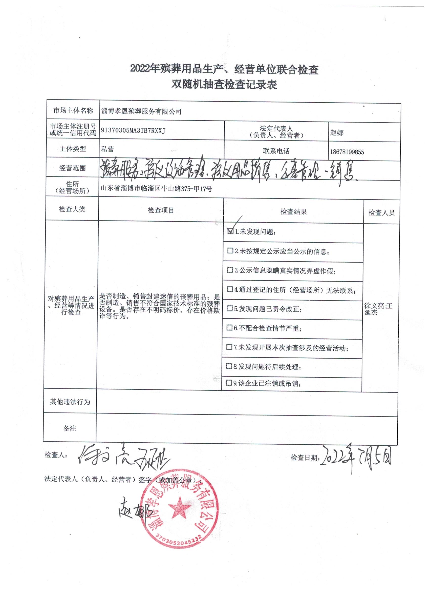 2022年殡葬用品生产、经营单位联合检查双随机抽查检查记录表