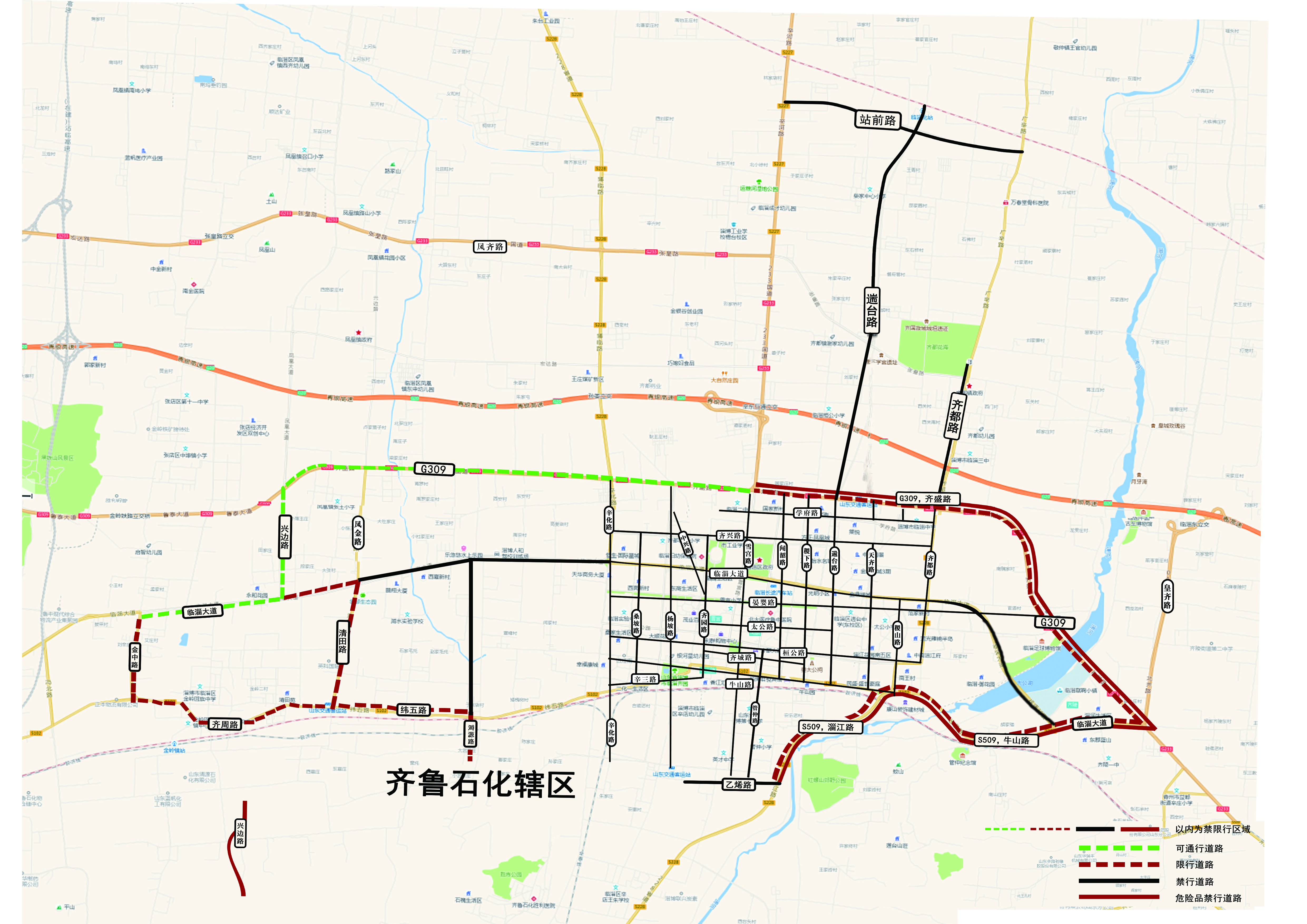 G309齐盛路(雪宫路至皇齐路)、临淄大道(皇齐路至美陵公司路口)、牛山路东延(美陵公司路口至稷山路)、淄江路(稷山路至乙烯路)、兴边路(南沣路至S102)禁止危险化学品运输车辆通行。