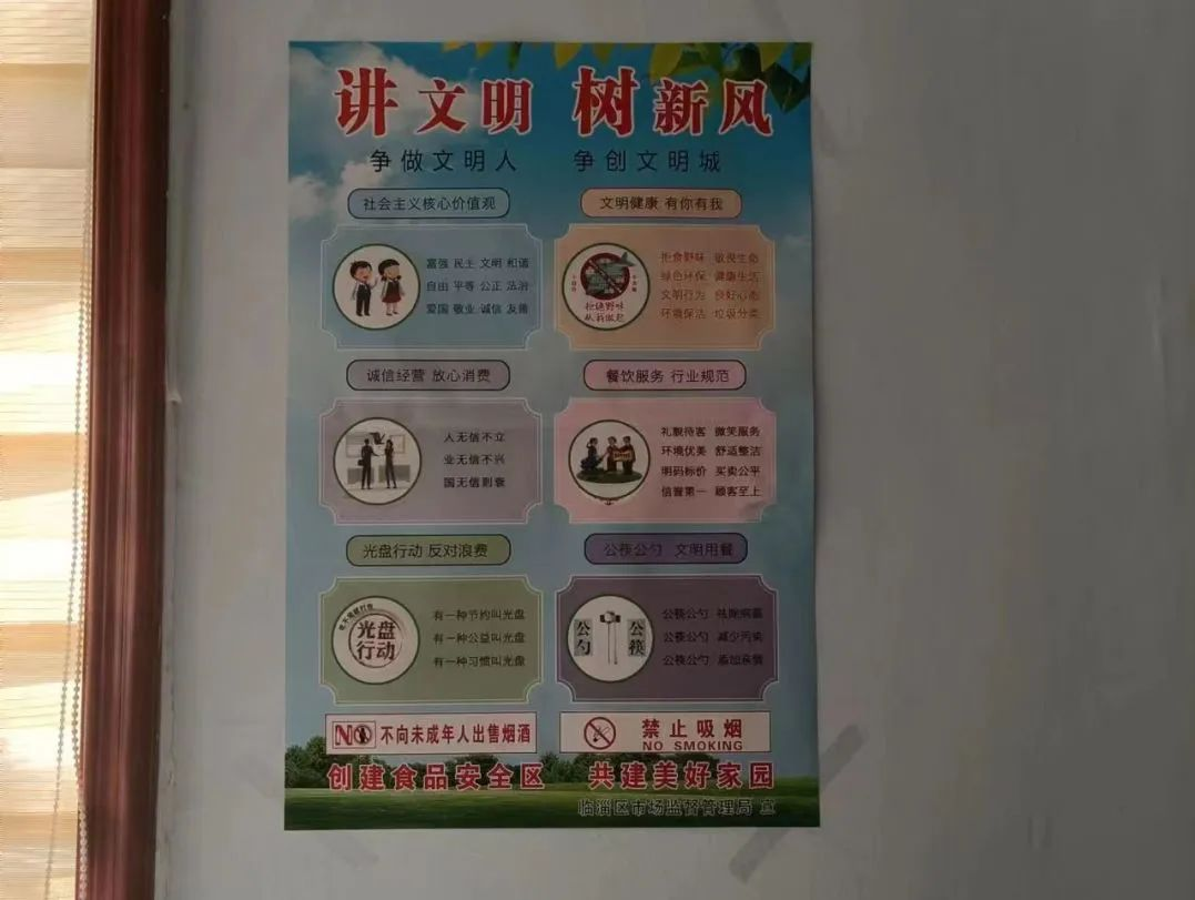 上榜理由:证照齐全并在醒目位置悬挂,经营场所干净整洁,商品摆放整齐明码标价,落实食品安全法要求,张贴杜绝铺张浪费公益宣传。