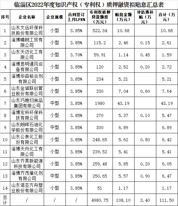 根据《山东省中小微企业知识产权质押融资贴息申报指南》和淄博市市场监管局《关于组织申报2022年度山东省中小微企业知识产权质押融资贴息工作的通知》(淄市监知字202319号)安排,区市场监管局下发通知,组织开展2022年度山东省中小微企业知识产权质押融资贴息申报工作。截至2023年3月31日,有14家企业申报材料经初审合格,拟逐级申报。公示如下: