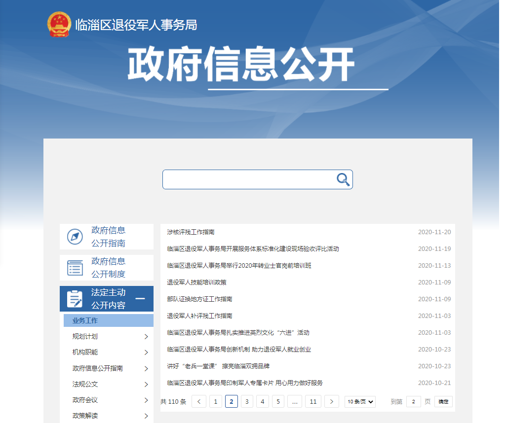 2020年,临淄区退役军人事务局认真贯彻落实《中华人民共和国政府信息公开条例》及政府信息公开工作要求健全政务公开工作机制,细化政务公开工作标准和流程主动回应社会关切,及时、准确、全面公开了各类信息,进一步提高工作透明度。