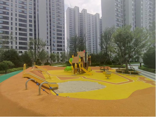 随便走吧,八栋高楼像张家界的石峰竖起,总之可以回家。走,看到大大的草坪,这里是小区的中心,里面有儿童游乐场地。以黄色为背景,供儿童玩耍,映衬了我们是黄河儿女的旋律。此外,有环形的跑道,每栋楼前的塑胶娱乐图案,增添了人文主义。
