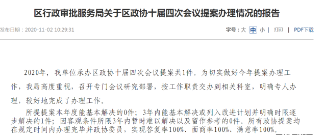 2、人大代表建议和政协提案办理结果情况。本年度收到人大建议0件;收到区政协十届五次会议21号提案,区政协十届五次会议85号提案,区政协十届五次会议86号提案,共3件提案。对所收到的提案建议区行政审批服务局进行了认真办理,办结率100%、满意率100%,并及时公开办理情况报告,接受社会监督。
