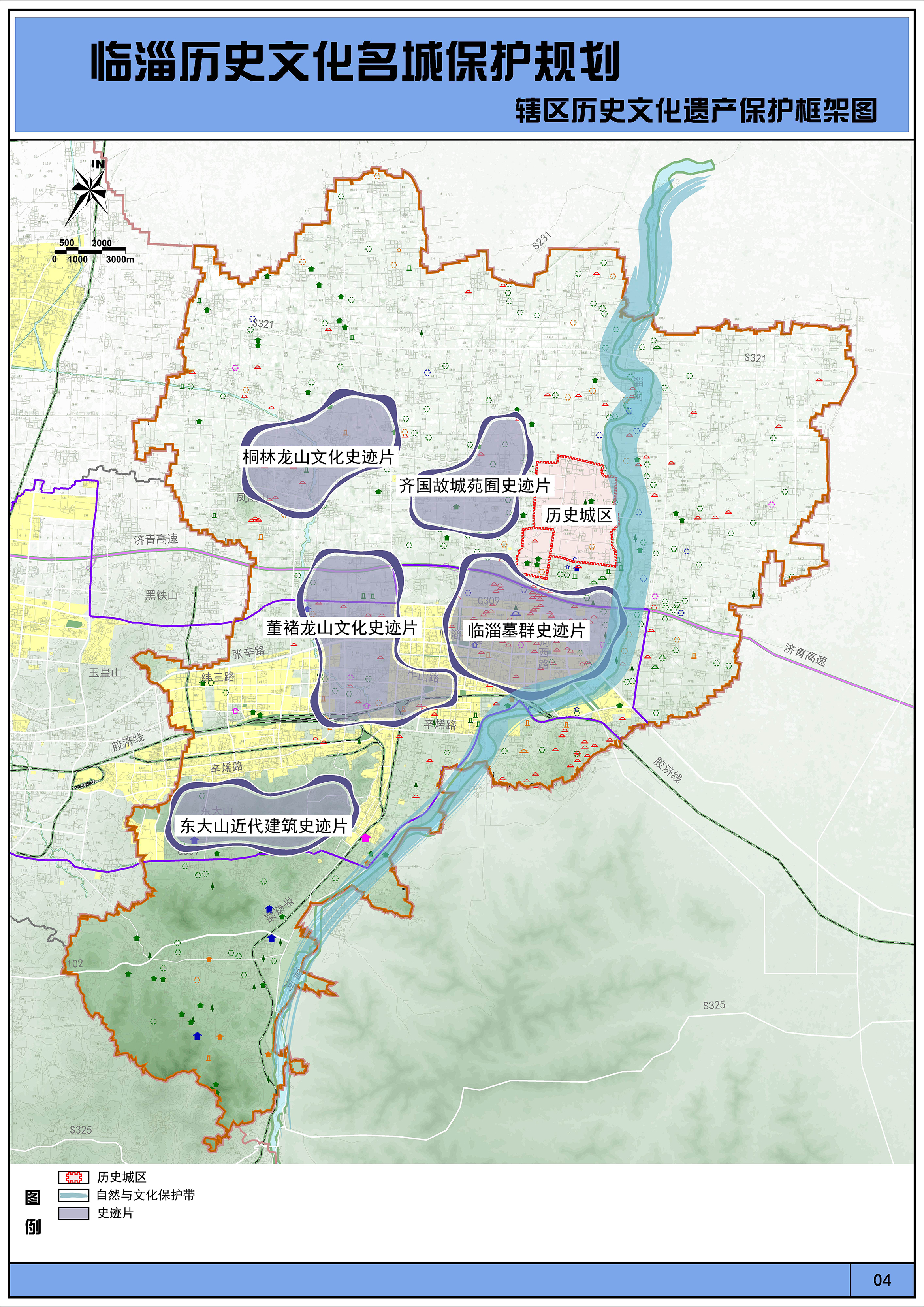 临淄辖域范围,规划形成“一城、一带、五片”的保护框架。