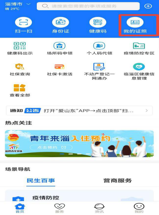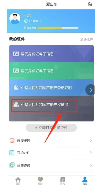 初次使用不动产电子亮证时,先添加订阅(以后不再进行此操作),亮证方(房屋权利人)通过手机端登录“爱山东”APP后,点击“我的证照”。