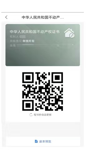 展示不动产权证书核验二维码。界面底部“副本预览”可查看不动产电子证照的照面信息。