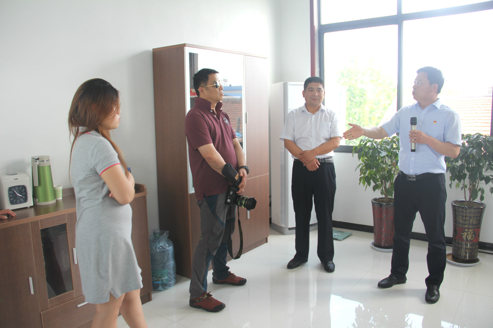镇党委书记孙守强在王营村厨具营销中心介绍相关情况