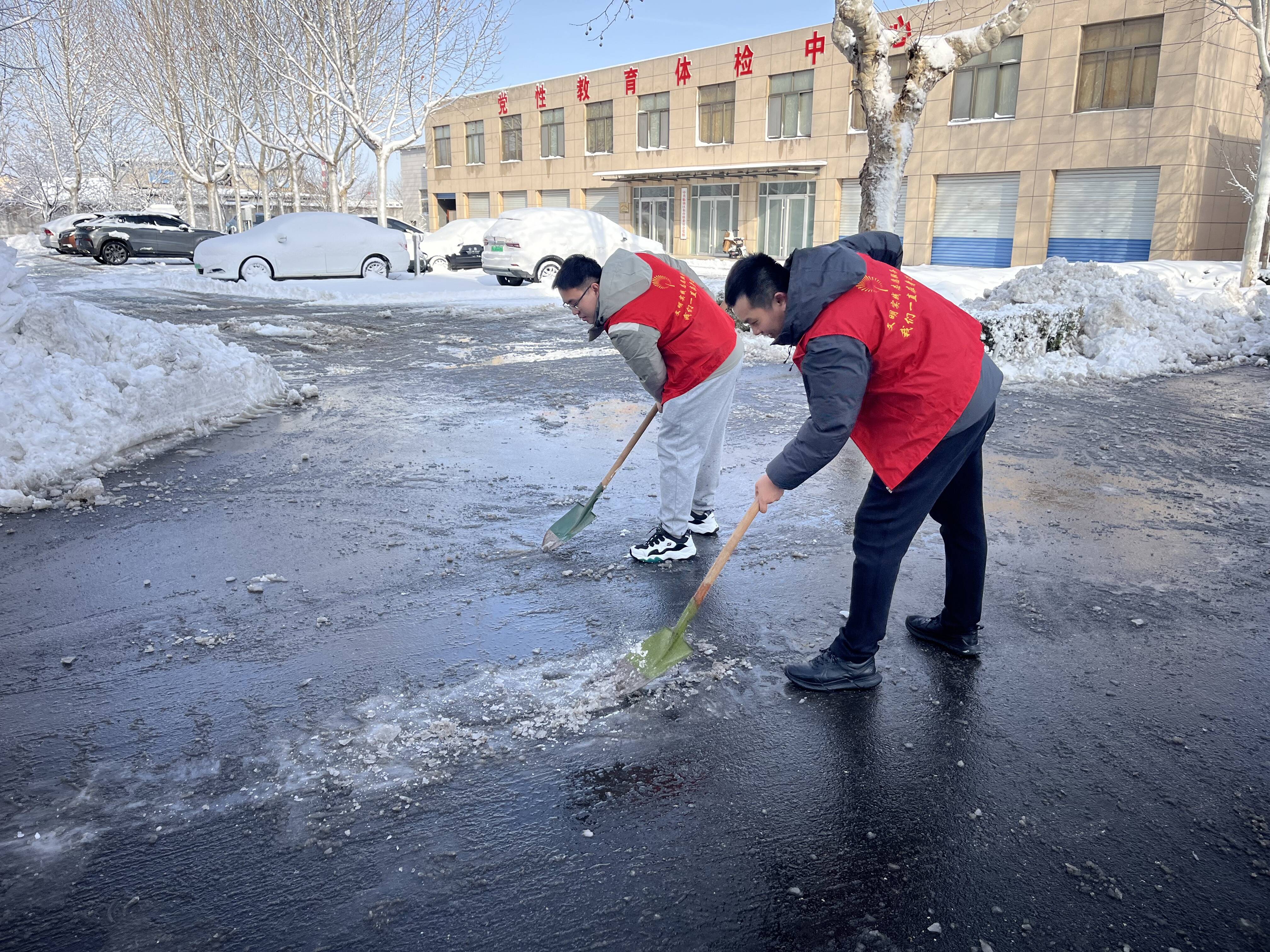 在机关,党员干部全体出动,围绕单位公共区域及门前周边进行清扫铲雪,保障群众往来安全。