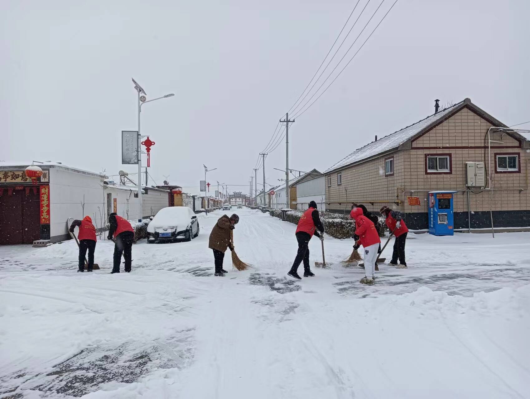 在村庄,各新时代文明实践志愿服务站号召热心志愿者集结成队,出动铲雪车,围绕大街小巷清路扫雪,保证出行安全。